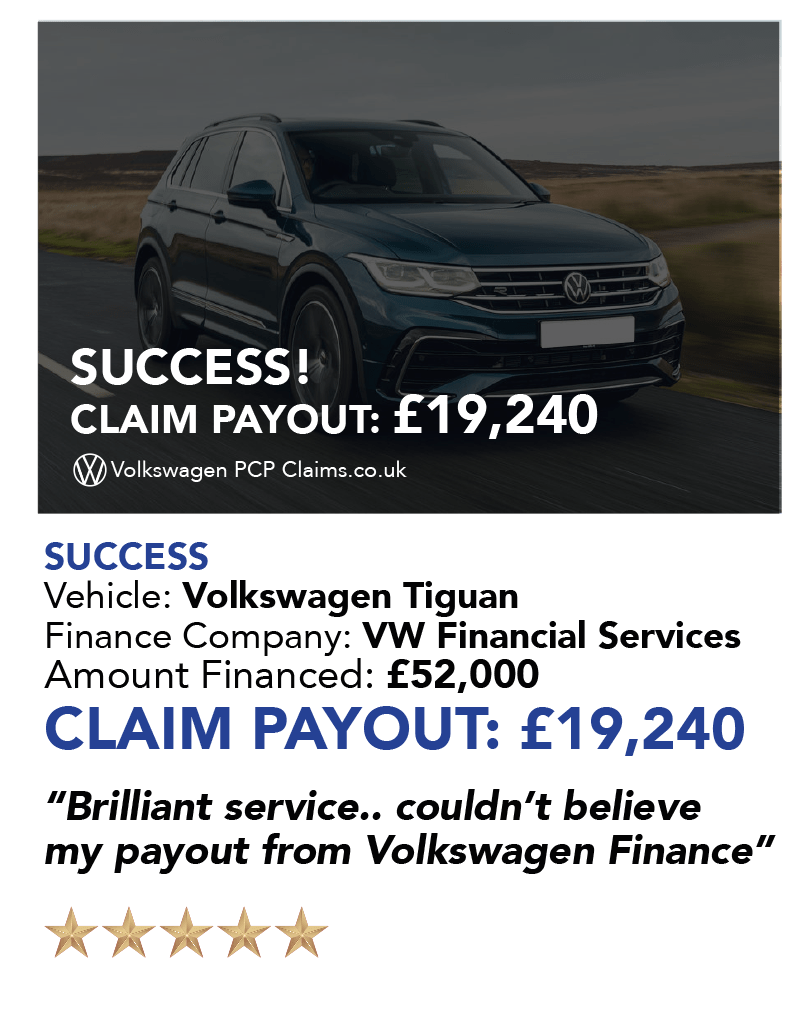 This depends on the amount that you financed and the APR, generally the higher the amount financed the larger the amount of claim. Whether you had a PCP or Hire Purchase, our average pay-out on Volkswagen’s is £13,500. Want to know how much your claim could be worth.